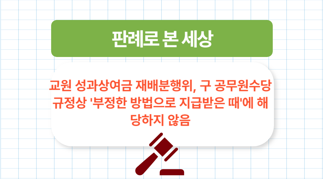 이번에 다룰 주제는 교원 성과상여금 재배분행위, 구 공무원수당규정상 '부정한 방법으로 지급받은 때'에 해당하지 않음 입니다.