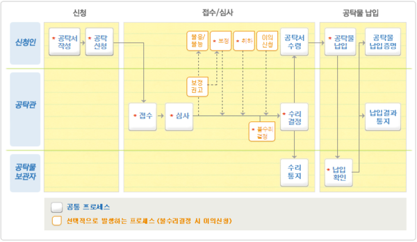 공탁을 신청하려고 하는 사람은 소정의 사항을 기재한 공탁서 2통을 작성하여 첨부서면과 함께 관할법원의 공탁관에게 제출해야 하고, 공탁관은 이를 접수하여 심사한 후 공탁수리여부를 결정하게 됩니다(대한민국 법원 전자공탁-이용안내-공탁절차-방문공탁-방문공탁신청절차).