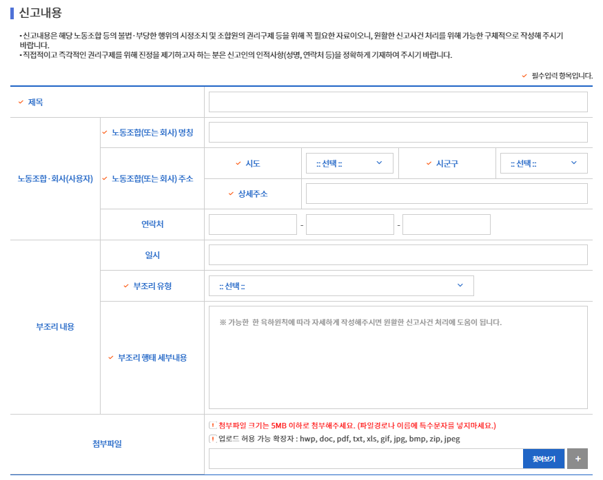 노노·노사 간 폭력 등을 통한 노동조합 활동 방해, 노동조합 재정 부정 사용, 포괄임금 오·남용 등 노사법치주의와 공정한 노사문화를 저해하는 노사의 불법·부당행위인 노사의 부조리 행위를 신고하는 신고센터입니다.
