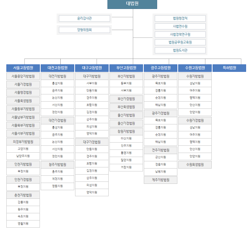 이번 포스팅은 遵法精神의 정책 및 기관 대한민국 법원 조직도, 대법원, 가정법원, 회생법원, 지방법원, 행정법원, 고등법원름에 대해 알아보았습니다.